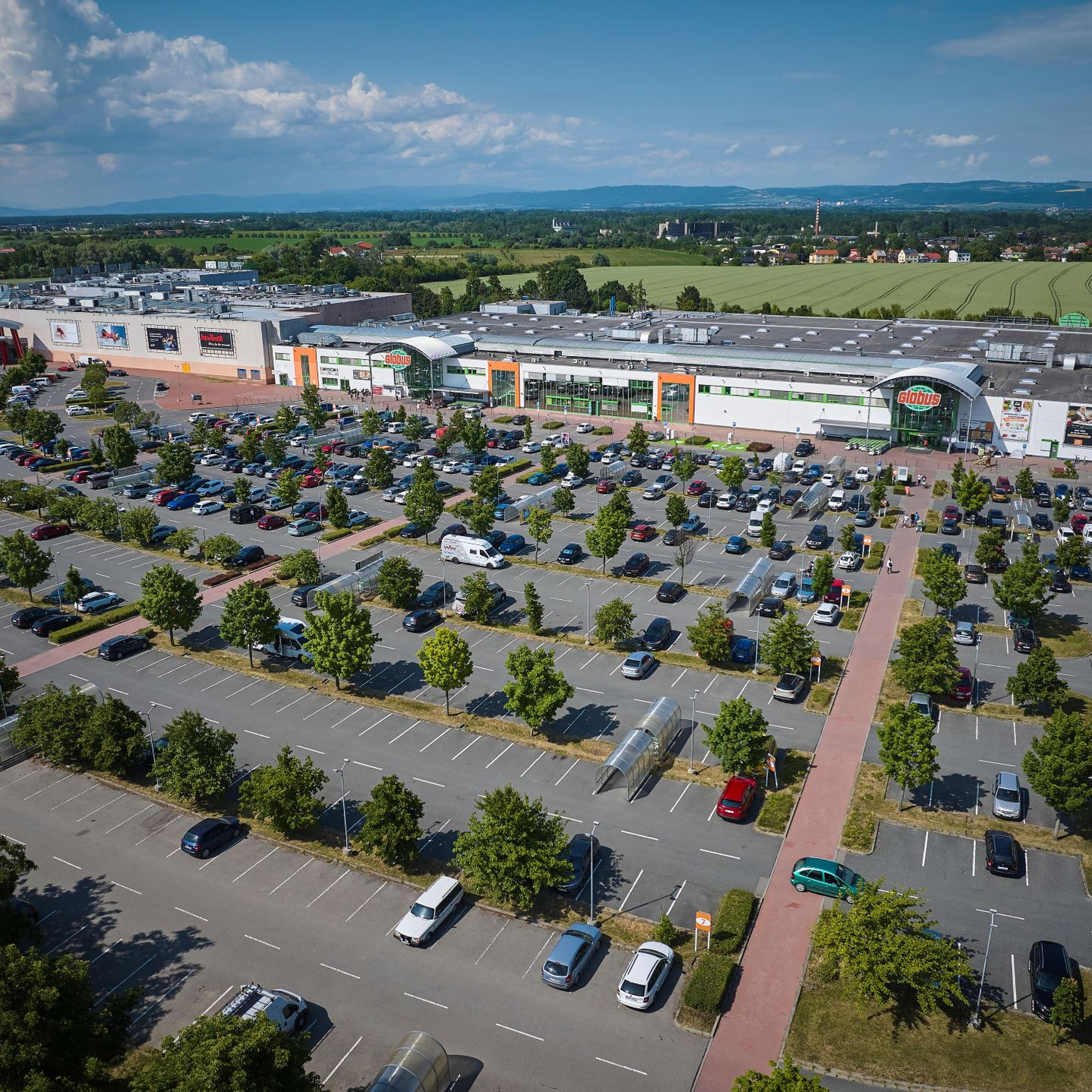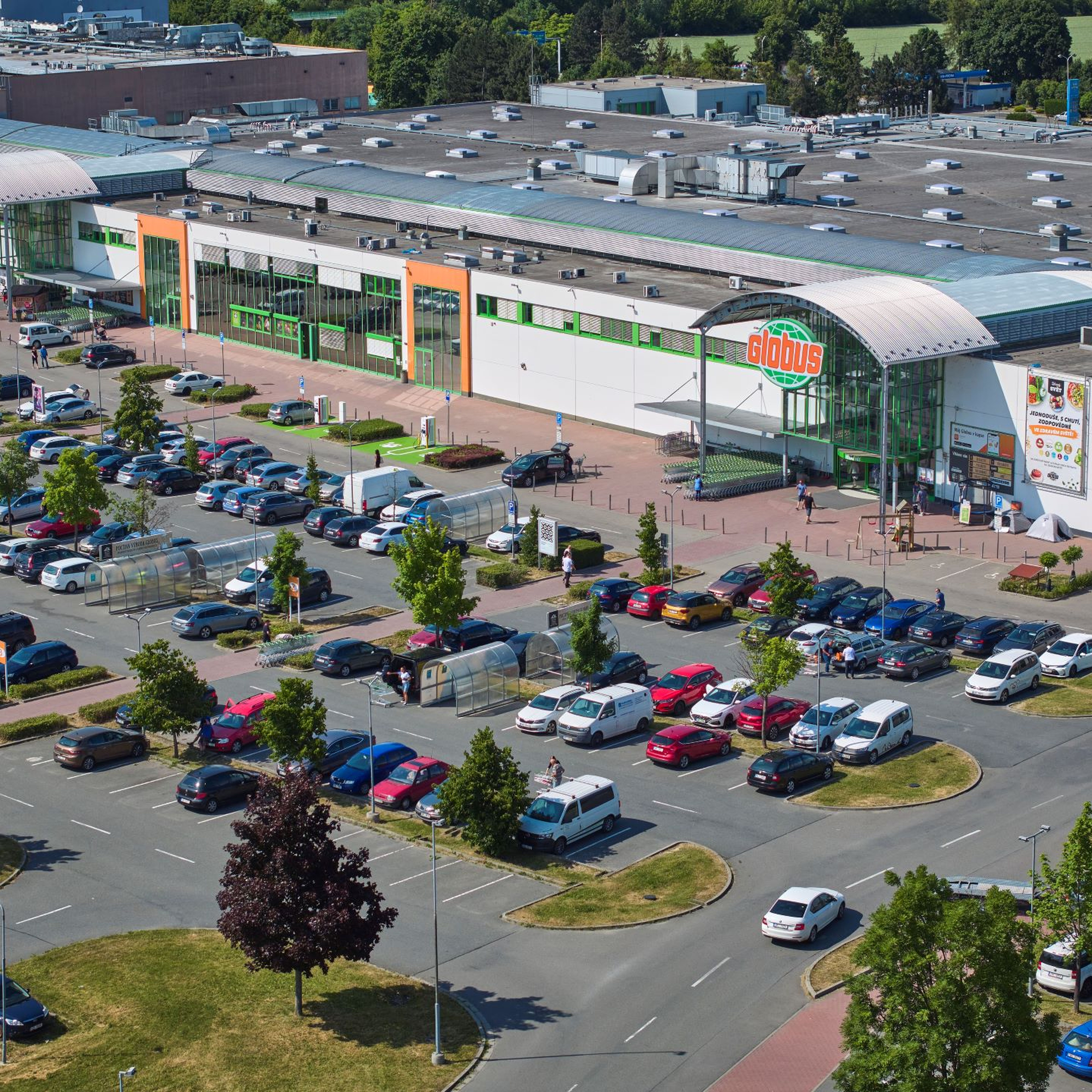 Velké parkoviště zdarma přímo před hypermarketem Globus.