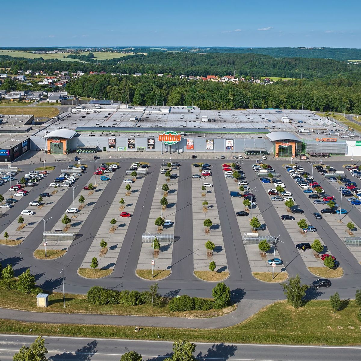 Velké parkoviště zdarma přímo před hypermarketem Globus.