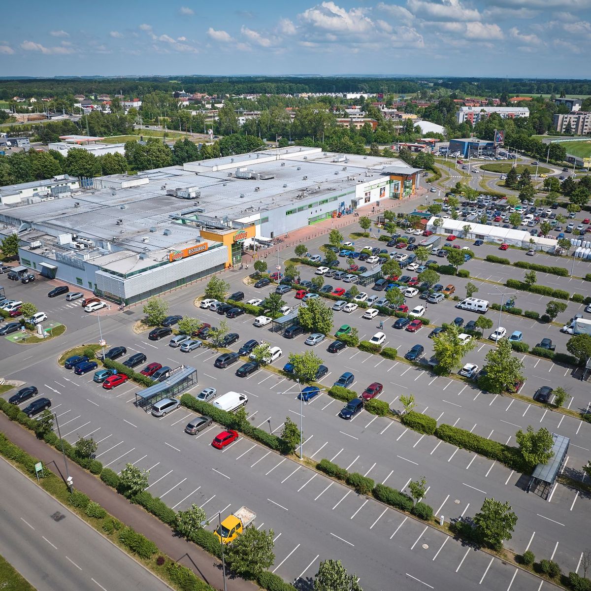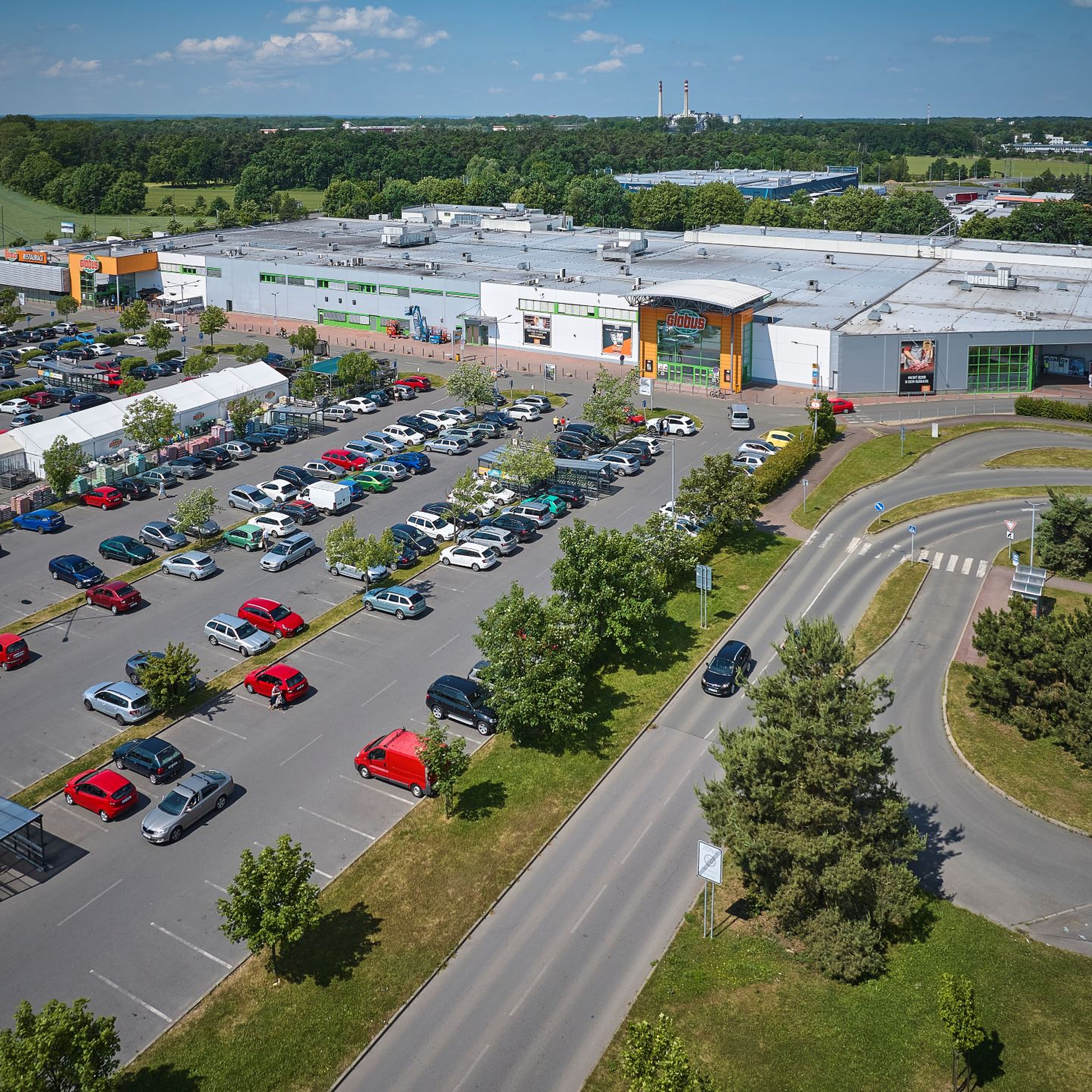 Velké parkoviště zdarma přímo před hypermarketem Globus.