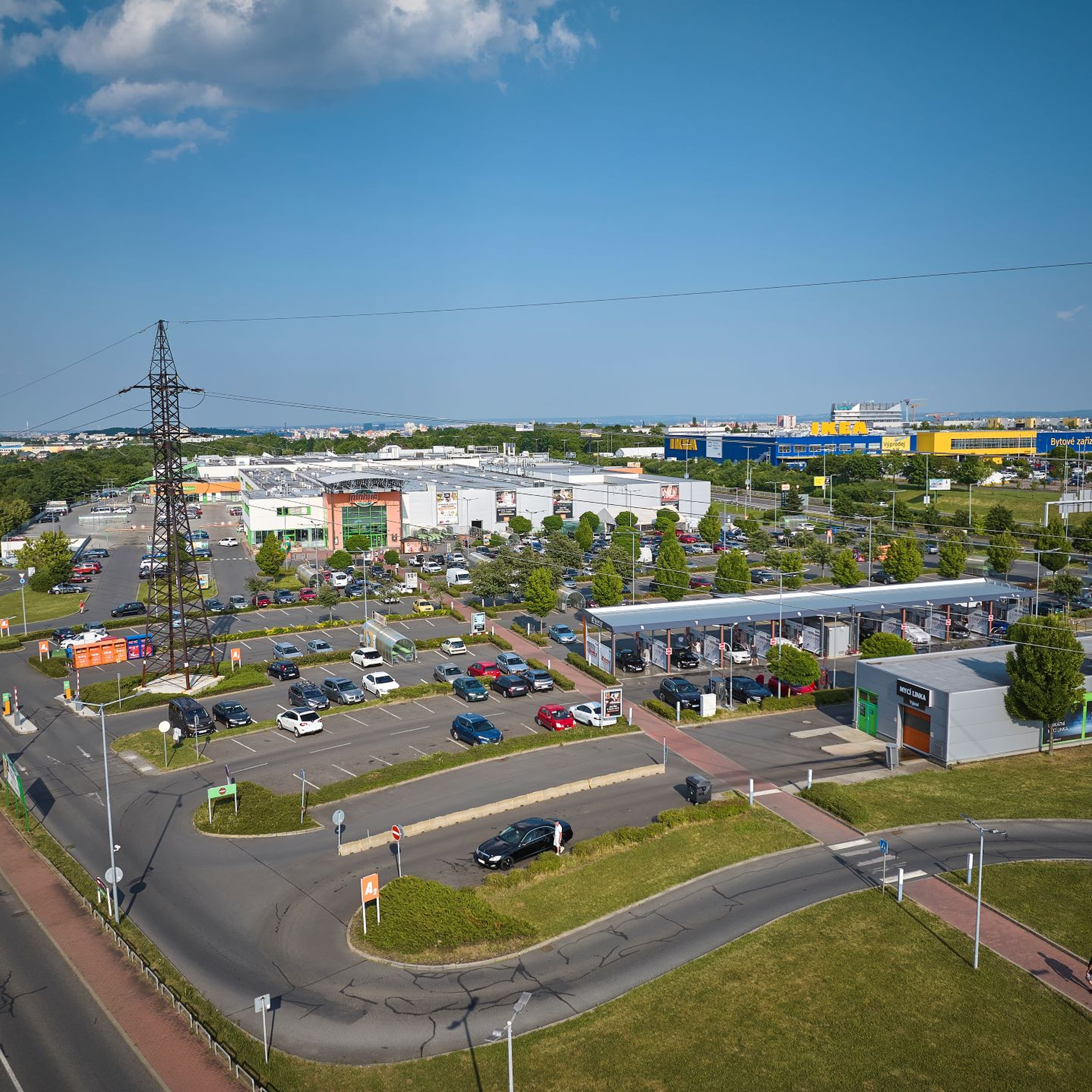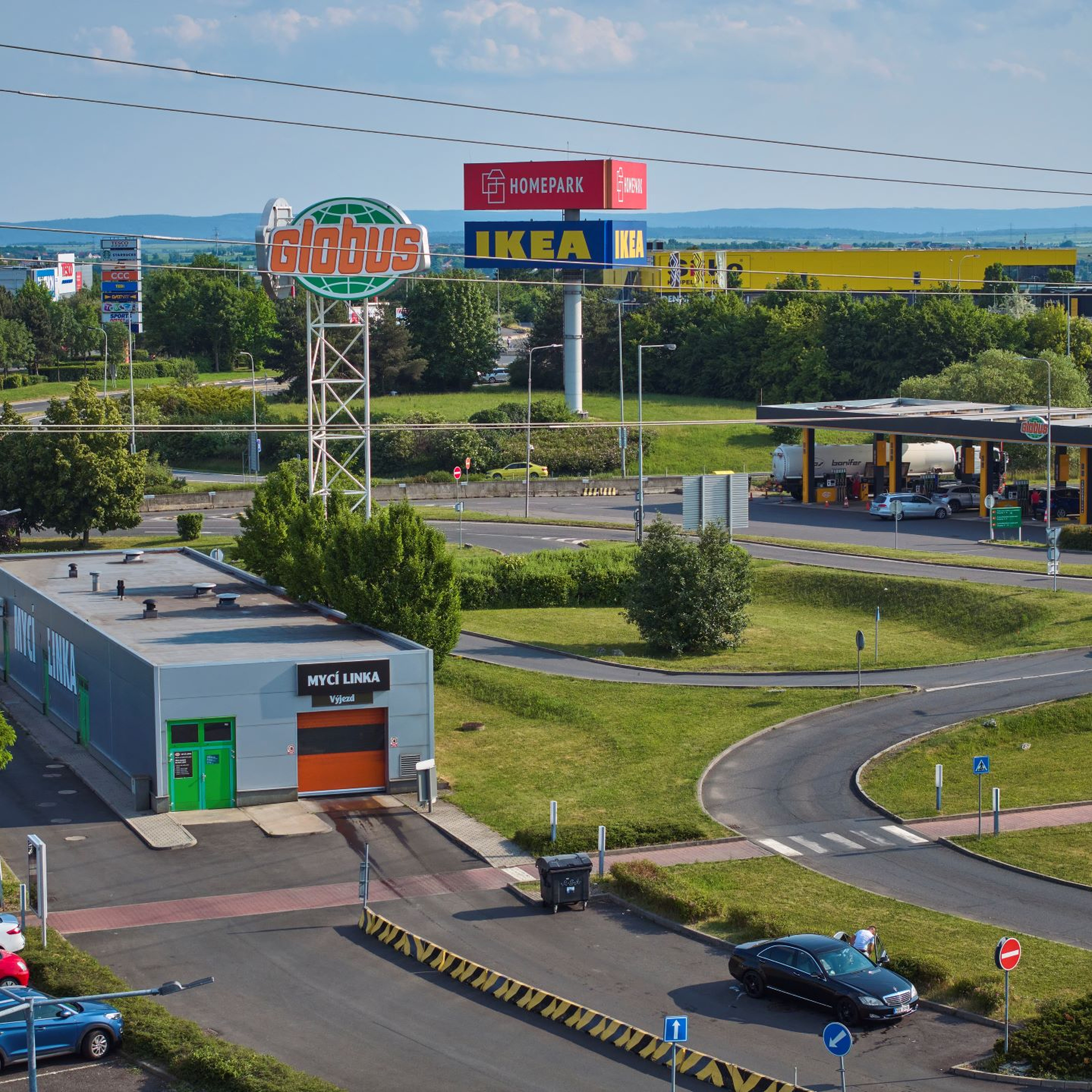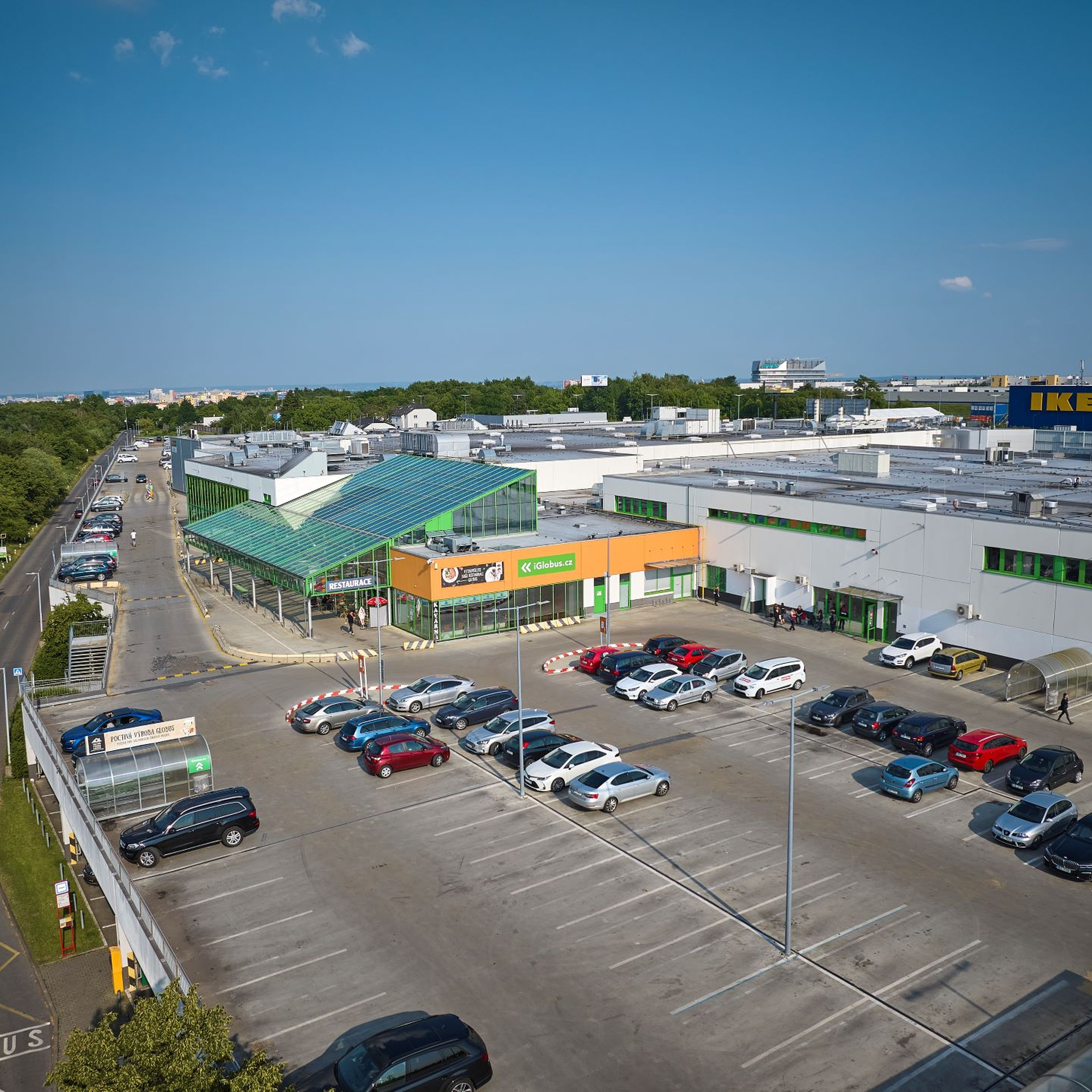 Velké parkoviště zdarma přímo před hypermarketem Globus.